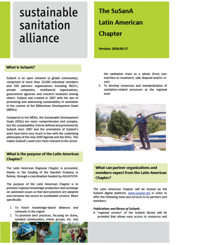 This summary gives an overview of main actions planned and what partner organisations and members can expect from the Latin American Chapter. The SuSanA Latin American Chapter initiated in September 2018 and its first phase will run until September 2020. The purpose of the Latin American Chapter is to promote regional knowledge production and exchange on sanitation issues so that best practices are adopted and everyone […]