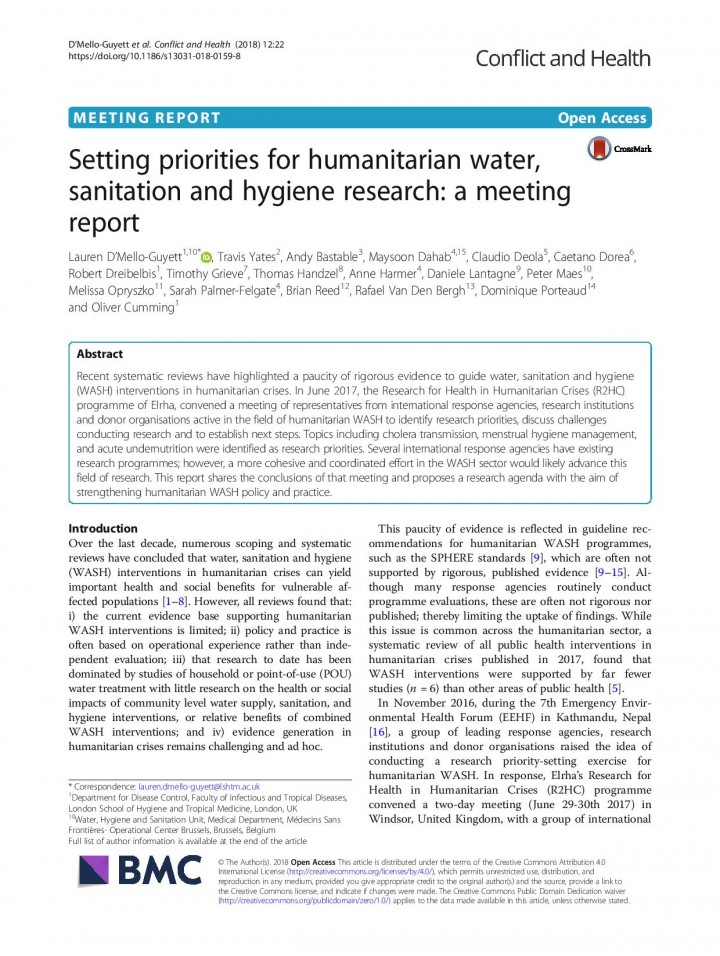 Recent systematic reviews have highlighted a paucity of rigorous evidence to guide water, sanitation and hygiene (WASH) interventions in humanitarian crises. In June 2017, the Research for Health in Humanitarian Crises (R2HC) programme of Elrha, convened a meeting of representatives from international response agencies, research institutions and donor organisations active in the field of humanitarian WASH to identify research priorities, discuss challenges conducting research and […]