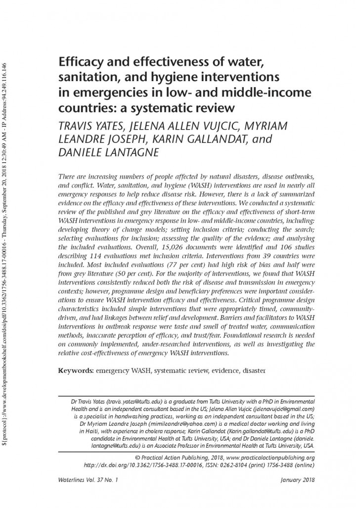 There are increasing numbers of people affected by natural disasters, disease outbreaks, and conflict. Water, sanitation, and hygiene (WASH) interventions are used in nearly all emergency responses to help reduce disease risk. However, there is a lack of summarized evidence on the efficacy and effectiveness of these interventions. We conducted a systematic review of the published and grey literature on the efficacy and effectiveness of […]