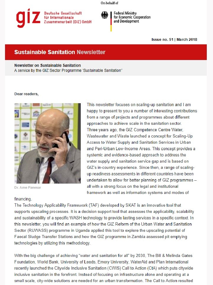 This newsletter will provide you with a set of updates from the GIZ bilateral water and sanitation programmes in Africa, Asia, MENA and Latin America as well as a selection of news from other sustainable sanitation projects worldwide. This newsletter focuses on scaling-up sanitation.