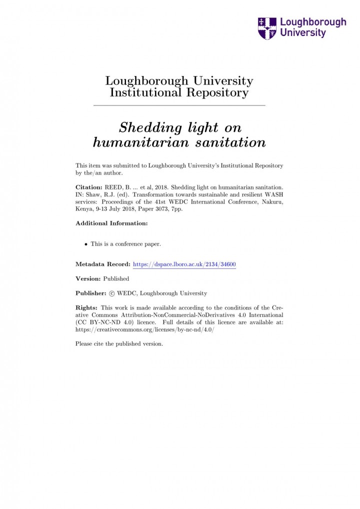 Lighting should be provided for WASH facilities in Humanitarian contexts according to several standards. Evidence for this and the practical budget, operational and management responsibilities are less clear. A three-country research project looking at the impact of lighting on WASH use and Gender-based Violence (GBV) required a multi-disciplinary approach, combining OXFAM’s practical implementing expertise with WEDC’s research-orientated approach. The research showed how much more is […]