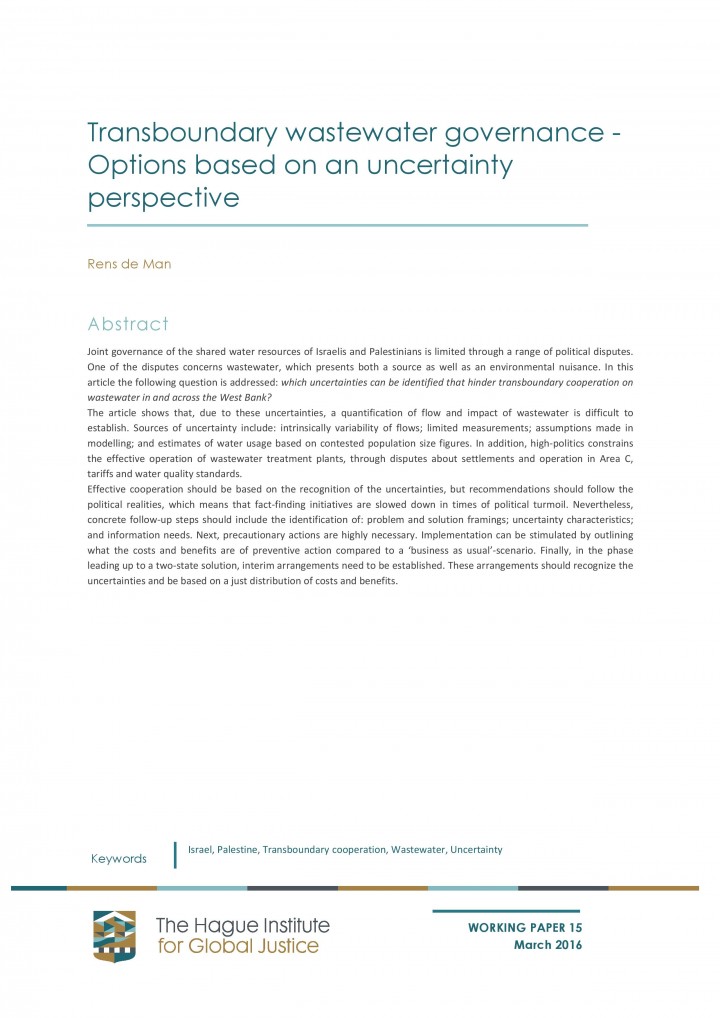 Joint governance of the shared water resources of Israelis and Palestinians is limited through a range of political disputes. One of the disputes concerns wastewater, which presents both a source as well as an environmental nuisance. In this article the following question is addressed: which uncertainties can be identified that hinder transboundary cooperation on wastewater in and across the West Bank?