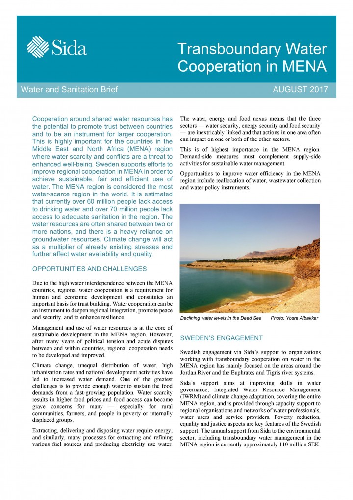 Cooperation around shared water resources has the potential to promote trust between countries and to be an instrument for larger cooperation. This is highly important for the countries in the Middle East and North Africa (MENA) region where water scarcity and conflicts are a threat to enhanced well-being. Sweden supports efforts to improve regional cooperation in MENA in order to achieve sustainable, fair and efficient […]