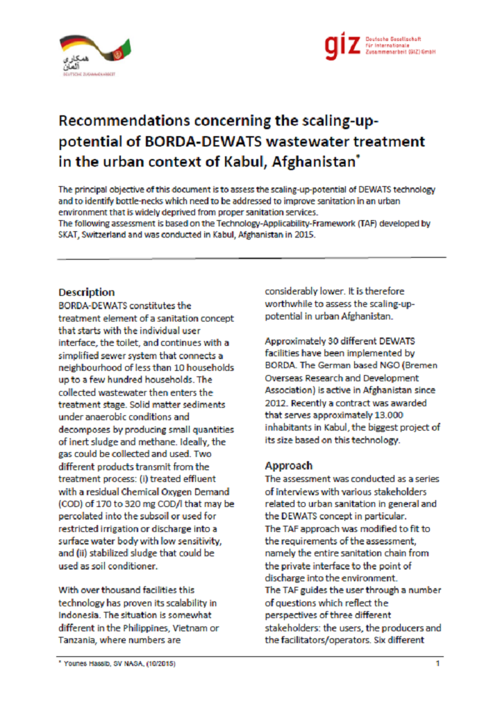 The principal objective of this document is to assess the scaling-up-potential of DEWATS technology and to identify bottle-necks which need to be addressed to improve sanitation in an urban environment that is widely deprived from proper sanitation services. The following assessment is based on the Technology-Applicability-Framework (TAF) developed by SKAT, Switzerland and was conducted in Kabul, Afghanistan in 2015.