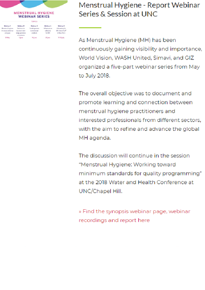 As Menstrual Hygiene (MH) has been continuously gaining visibility and importance, World Vision, WASH United, Simavi, and GIZ organized a five-part webinar series from May to July 2018. Each webinar aimed to address one of the key aspects of MH management, including evidence (webinar 1), knowledge (webinar 2), menstrual products (webinar 3), infrastructure (webinar 4) and policy (webinar 5) providing an overview and sharing good practices […]
