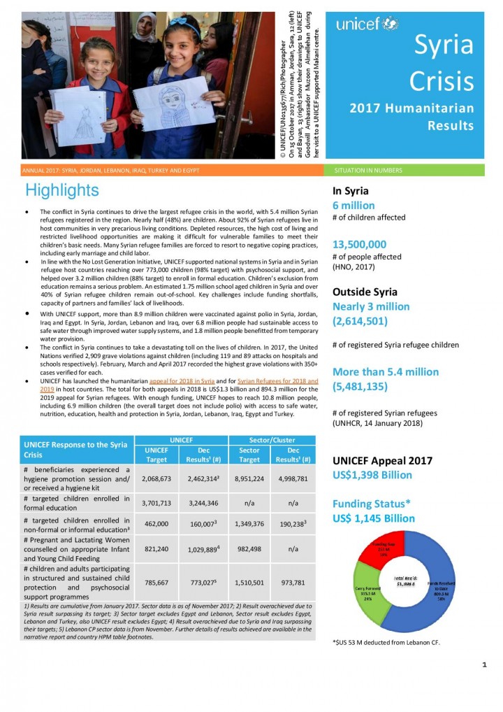 UNICEF Syria Crisis Situation Report - 2017 Humanitarian Results - The conflict in Syria continues to drive the largest refugee crisis in the world, with 5.4 million Syrian refugees registered in the region. Nearly half (48%) are children. About 92% of Syrian refugees live in host communities in very precarious living conditions. - In line with the No Lost Generation Initiative, UNICEF supported national systems in […]