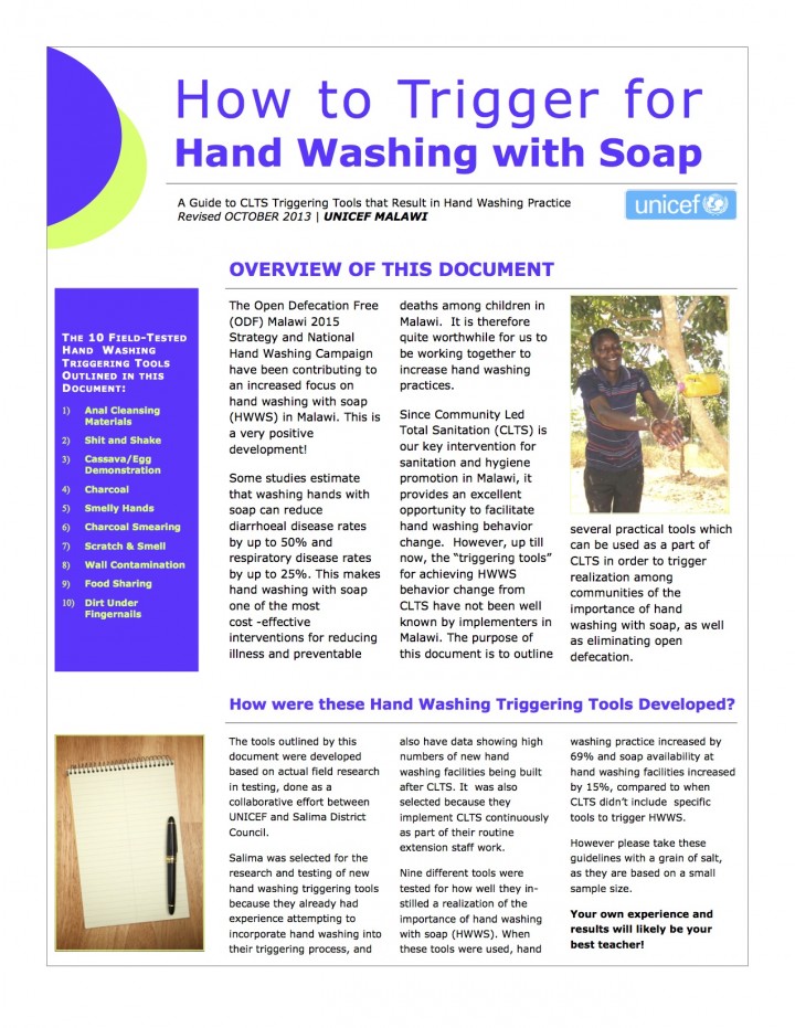 Since Community Led Total Sanitation (CLTS) is our key intervention for sanitation and hygiene promotion in Malawi, it provides an excellent opportunity to facilitate hand washing behavior change. However, up till now, the “triggering tools” for achieving HWWS behavior change from CLTS have not been well known by implementers in Malawi. The purpose of this document is to outline several practical tools which can be […]