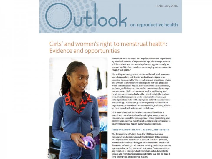 This issue of Outlook establishes menstrual health as a sexual and reproductive health and rights issue; presents the obstacles to and the consequences of not promoting and protecting menstrual health; and highlights opportunities to improve menstrual health in low-resource settings.