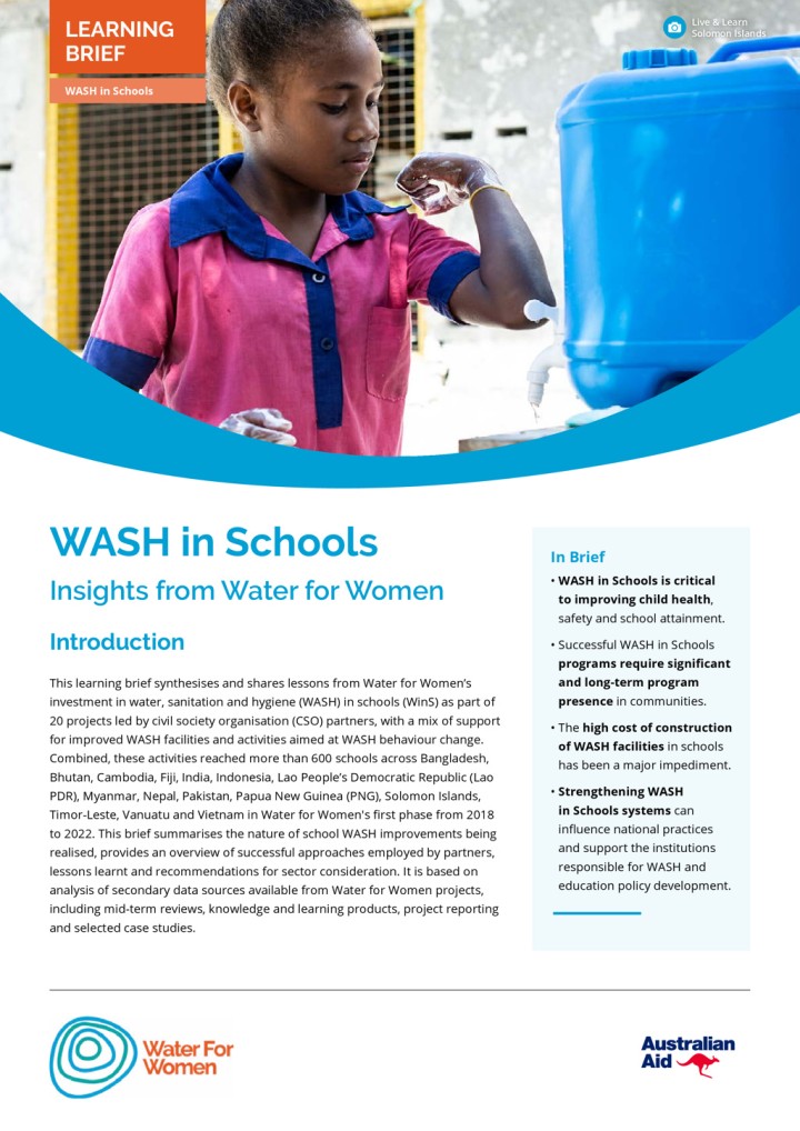This learning brief synthesises and shares lessons from Water for Women’s investment in water, sanitation and hygiene in schools as part of 20 projects led by civil society organisation partners, with a mix of support for improved WASH facilities and activities aimed at WASH behaviour change. Combined, these activities reached more than 600 schools across Bangladesh, Bhutan, Cambodia, Fiji, India, Indonesia, Lao People’s Democratic Republic (Lao […]
