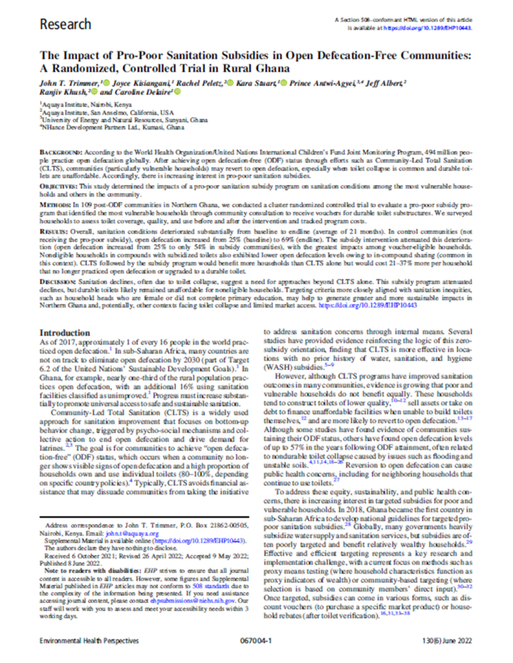 According to the World Health Organization/United Nations International Children’s Fund Joint Monitoring Program, 494 million people practice open defecation globally. After achieving open defecation-free (ODF) status through efforts such as Community-Led Total Sanitation (CLTS), communities (particularly vulnerable households) may revert to open defecation, especially when toilet collapse is common and durable toilets are unaffordable. Accordingly, there is increasing interest in pro-poor sanitation subsidies. This study, produced […]