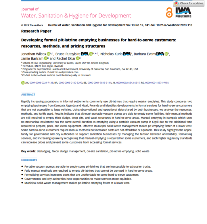 This study compares pit-latrine emptying businesses in Kampala, Uganda, and Kigali, Rwanda, focusing on resources, methods, and tariffs. Empirical data from Forever Sanitation and Pit Vidura show challenges with portable vacuum pumps in hard-to-reach areas, highlighting the need for formal manual emptying for some customers where mechanical methods are not viable. Manual emptying has similar duration to using a portable pump because of the additional […]