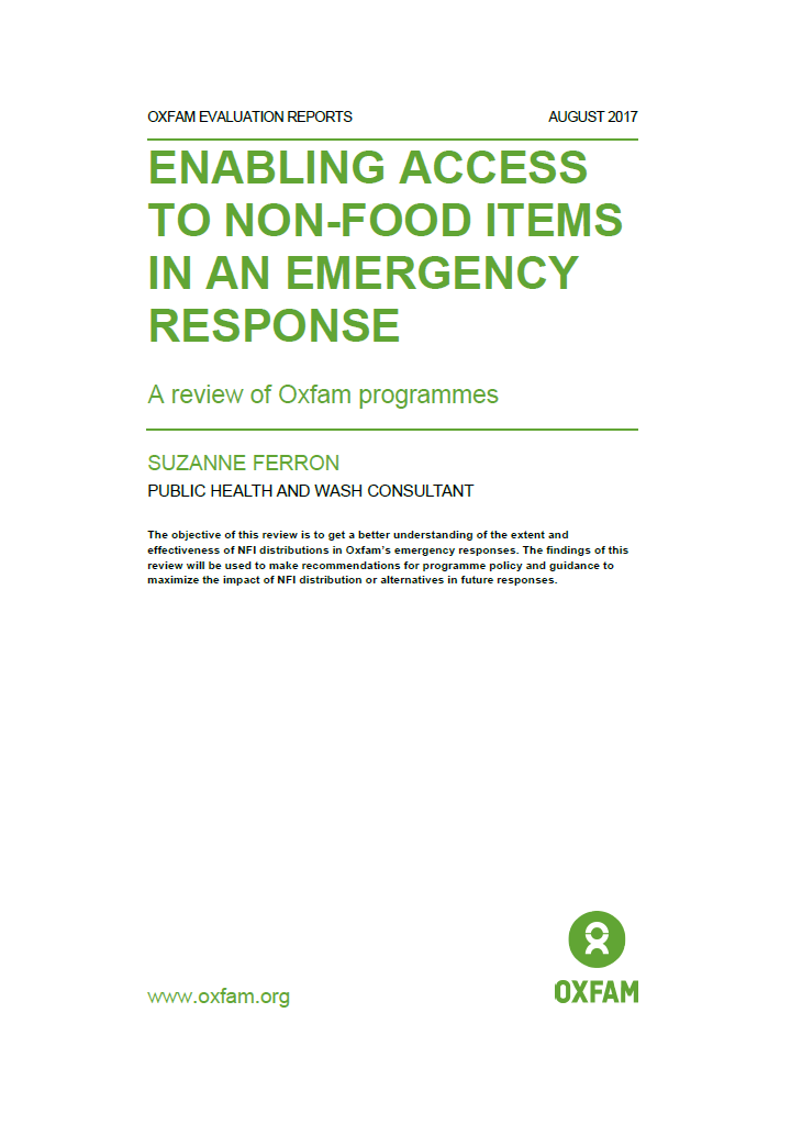 This review aimed to get a better understanding of the extent and effectiveness of non-food item (NFI) distributions in Oxfam programmes, in order to develop recommendations for programme policy and guidance to maximize the impact of NFI distributions or alternatives in future responses. Documentation relating to 15 recent WASH responses was examined and key informant interviews were conducted with some of the key Oxfam staff […]