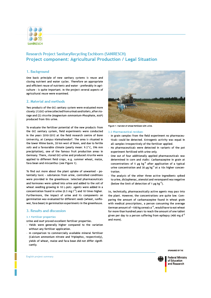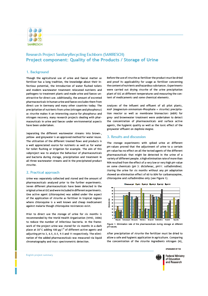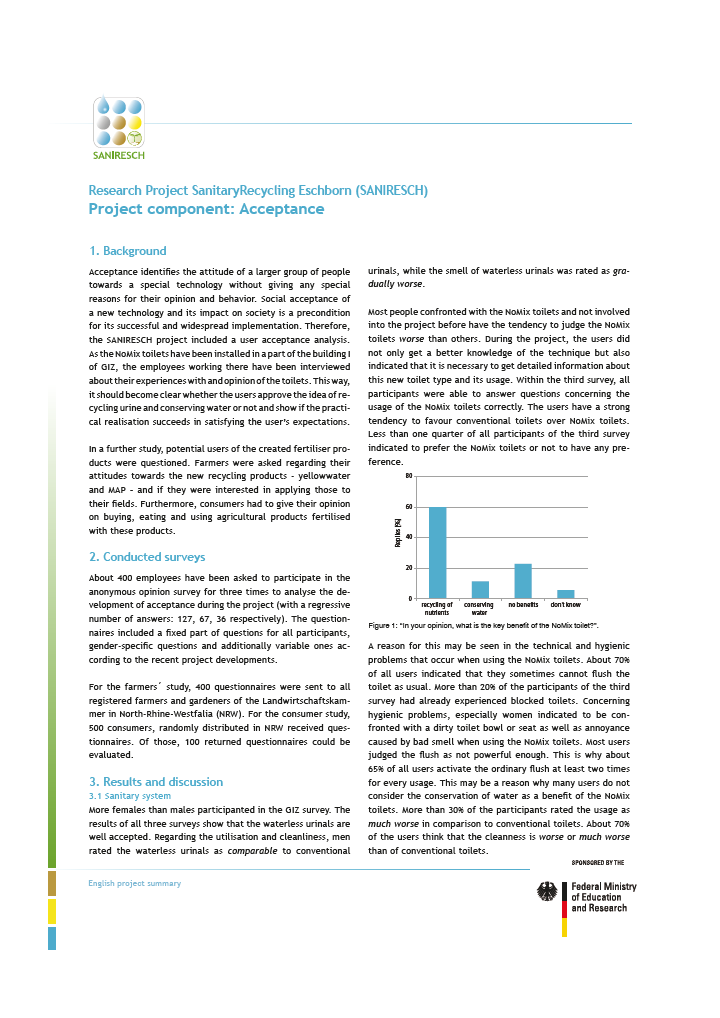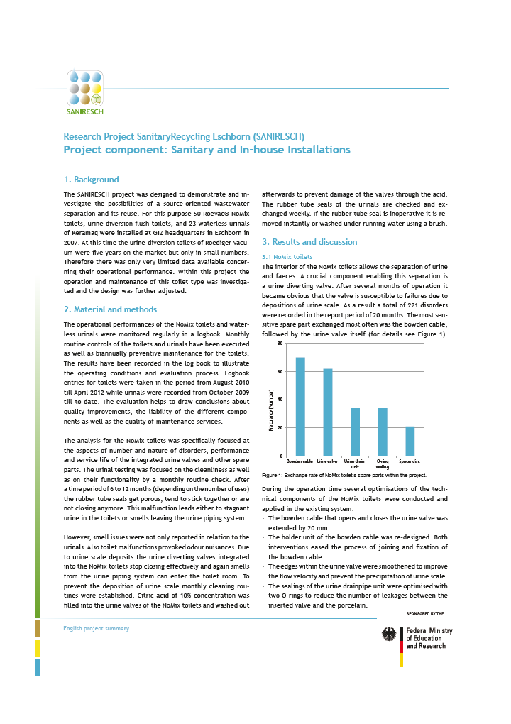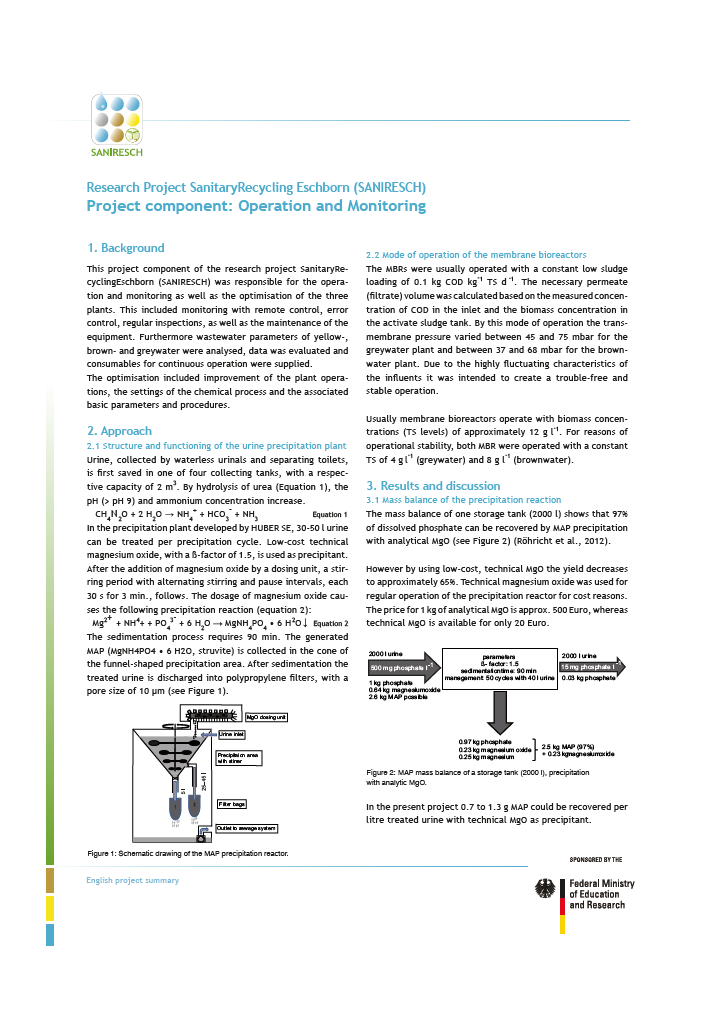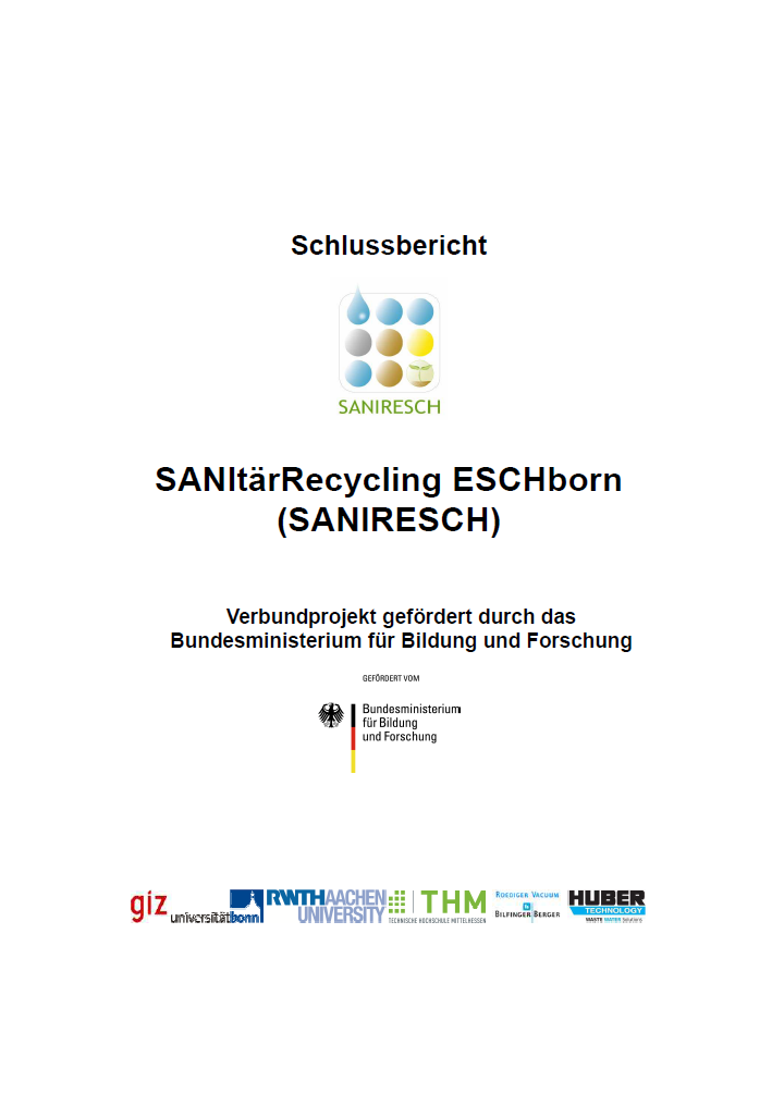 SANIRESCH was running from July 2009 till Decemeber 2012. The results of the project were presented in periodical project meetings. There is also an English summary available in which the most important slides of the different presentations are translated into English. The factsheets for each project components can be download under each project component library entries.
