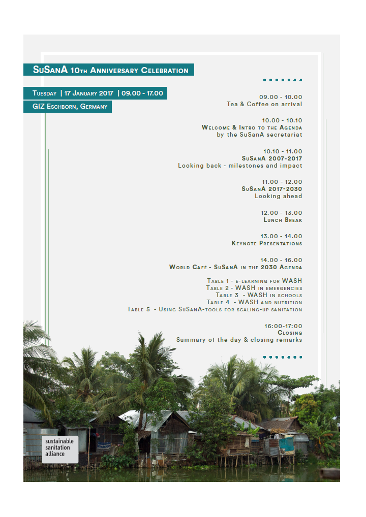 On Tuesday the 17th of January 2017, the Sustainable Sanitation Alliance (SuSanA) celebrated its 10th anniversary in Eschborn, Germany where SuSanA was founded in 2007 by a range of actors who were actively involved in the sanitation sector. This year’s anniversary celebration took place under the theme "10 years SuSanA: How the changed sanitation paradigm contributes to the Sustainable Development Goals". During the celebration, SuSanA’s […]