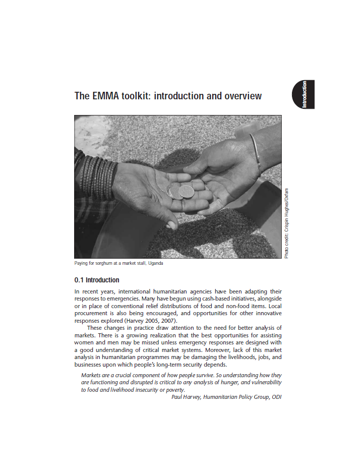 Emergency Market Mapping and Analysis (EMMA) is a set of tools (this toolkit) and guidance notes (the reference manual on CD-ROM). It encourages and assists front-line humanitarian staff in sudden-onset emergencies to better understand, accommodate, and make use of market systems. It does not offer a simplistic blue-print for action. However, EMMA does provide accessible, relevant guidance to staff who are not already specialists in […]