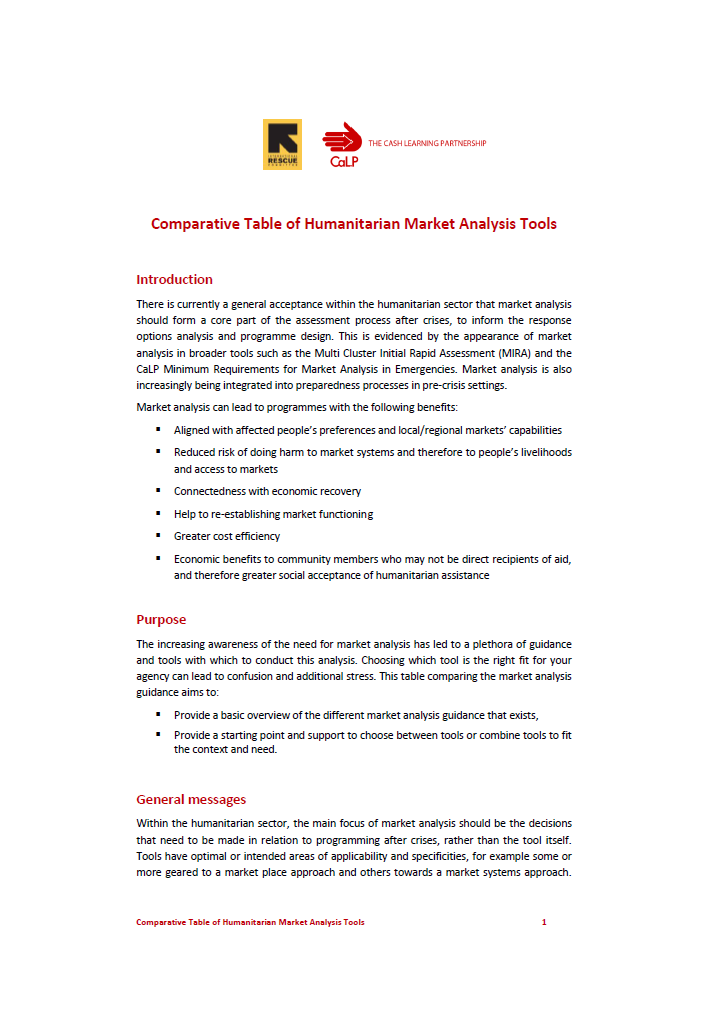 This document provides guidance for practitioners on conducting market analysis before the onset of an anticipated crisis using an adaptation of existing post-crisis market assessment tools. Recommendations stemming from this analysis could be used to inform preparedness and DRR programming decision making as well as future emergency responses. This guidance focuses on markets, with the objective to improve programming. As with any humanitarian initiative, the […]