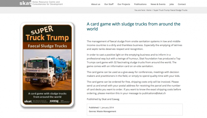 In order to cast a positive light on the emptying business and to inform in a professional way but with a twinge of humour, Skat Foundation has produced a Top Trumps card game with 32 fascinating sludge trucks from around the world. The game comes with an information card on on-site sanitation. The card game can be used as a give-away for conferences, meetings with decision […]