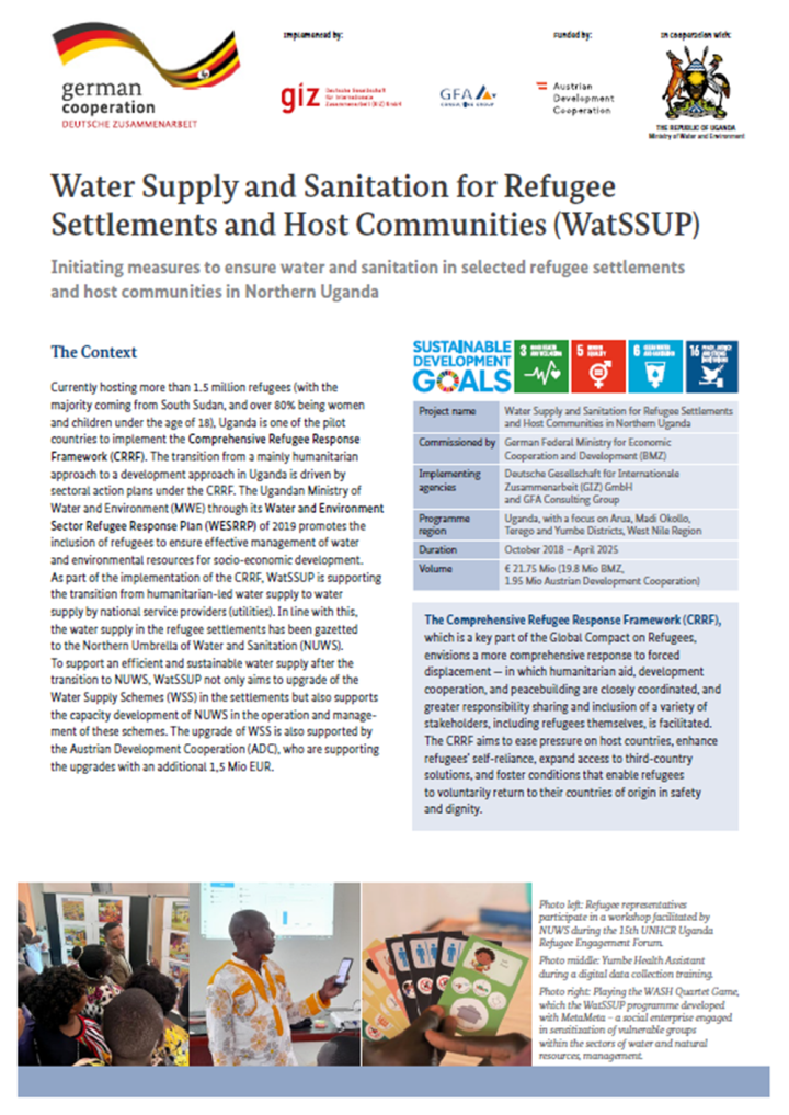 This page is a collection of the most important factsheets provided by the Water Supply and Sanitation for Refugee Settlements and Host Communities in Northern Uganda project (WatSSUP), implemented by GIZ, which is funded by the German Government through the Federal Ministry of Economic Cooperation and Development (BMZ).