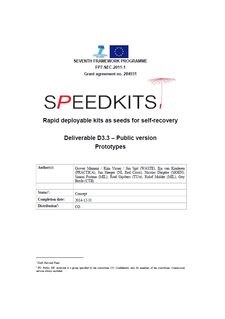 Within S(P)EEDKITS, workpackage WP3- “watsan” (water and sanitation) focuses on the development of flexible sanitation solutions suited for emergency cases and on low cost water kits that help to generate, transport and store (potable) water. Focus in both domains is on the easy deployment of the kits. This document reports on the prototypes for the various watsan kits and the outcome of the (first) testing.