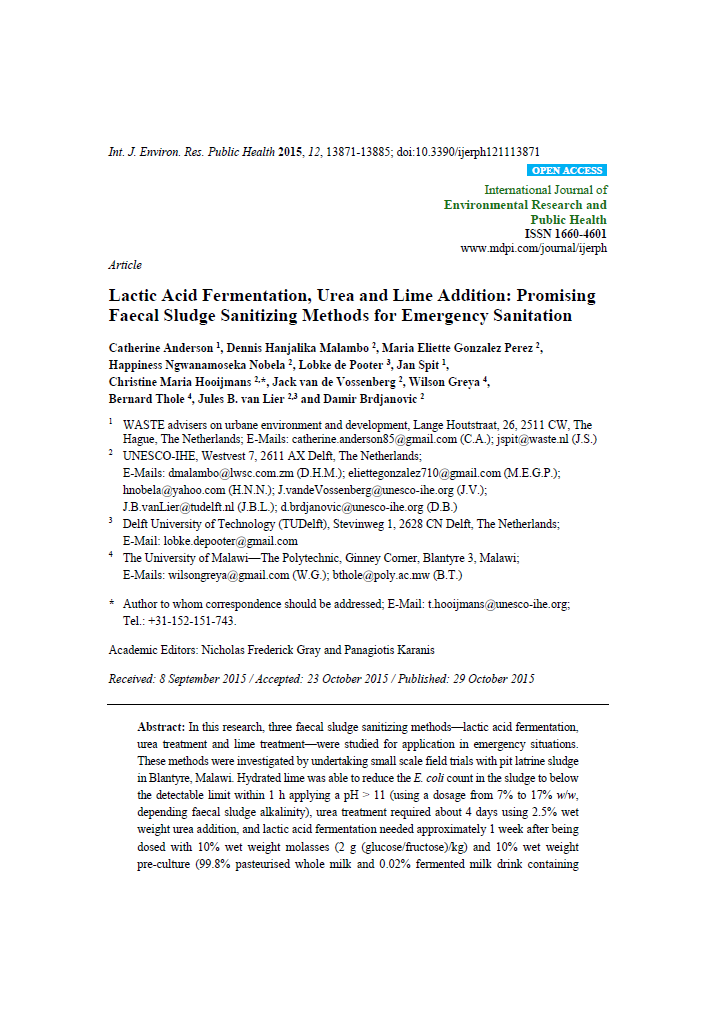 In this research, three faecal sludge sanitizing methods—lactic acid fermentation, urea treatment and lime treatment—were studied for application in emergency situations. These methods were investigated by undertaking small scale field trials with pit latrine sludge in Blantyre, Malawi. Hydrated lime was able to reduce the E. coli count in the sludge to below the detectable limit within 1 h applying a pH > 11 (using […]