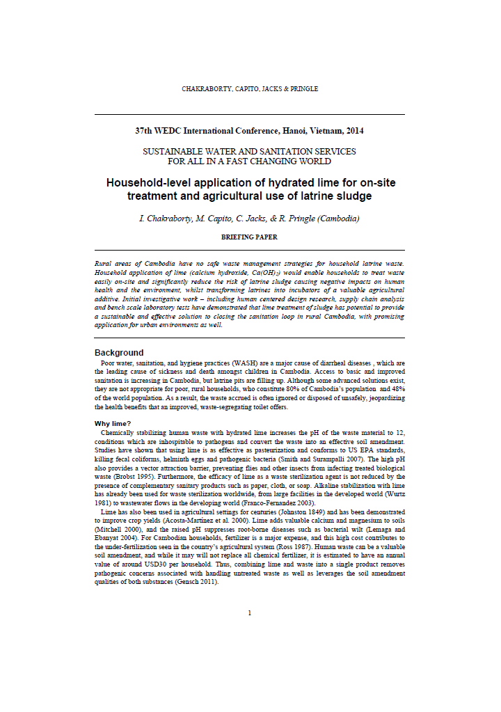 Rural areas of Cambodia have no safe waste management strategies for household latrine waste. Household application of lime (calcium hydroxide, Ca(OH)2) would enable households to treat waste easily on-site and significantly reduce the risk of latrine sludge causing negative impacts on human health and the environment, whilst transforming latrines into incubators of a valuable agricultural additive. Initial investigative work – including human centered design research, […]