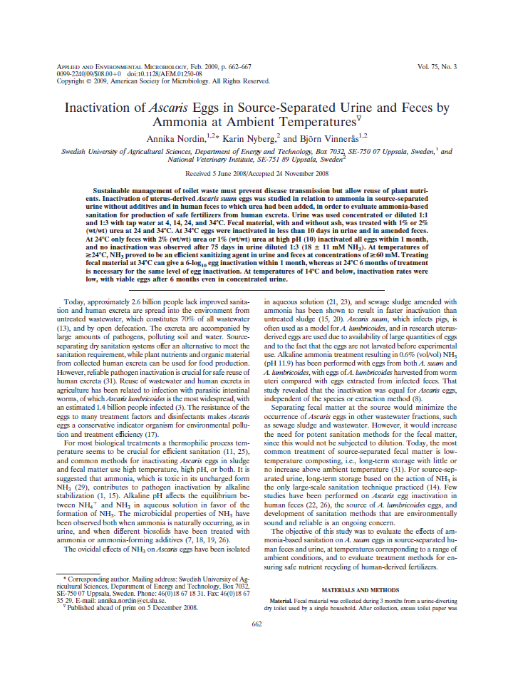 Sustainable management of toilet waste must prevent disease transmission but allow reuse of plant nutrients. Inactivation of uterus-derived Ascaris suum eggs was studied in relation to ammonia in source-separated urine without additives and in human feces to which urea had been added, in order to evaluate ammonia-based sanitation for production of safe fertilizers from human excreta. Urine was used concentrated or diluted 1:1 and 1:3 […]
