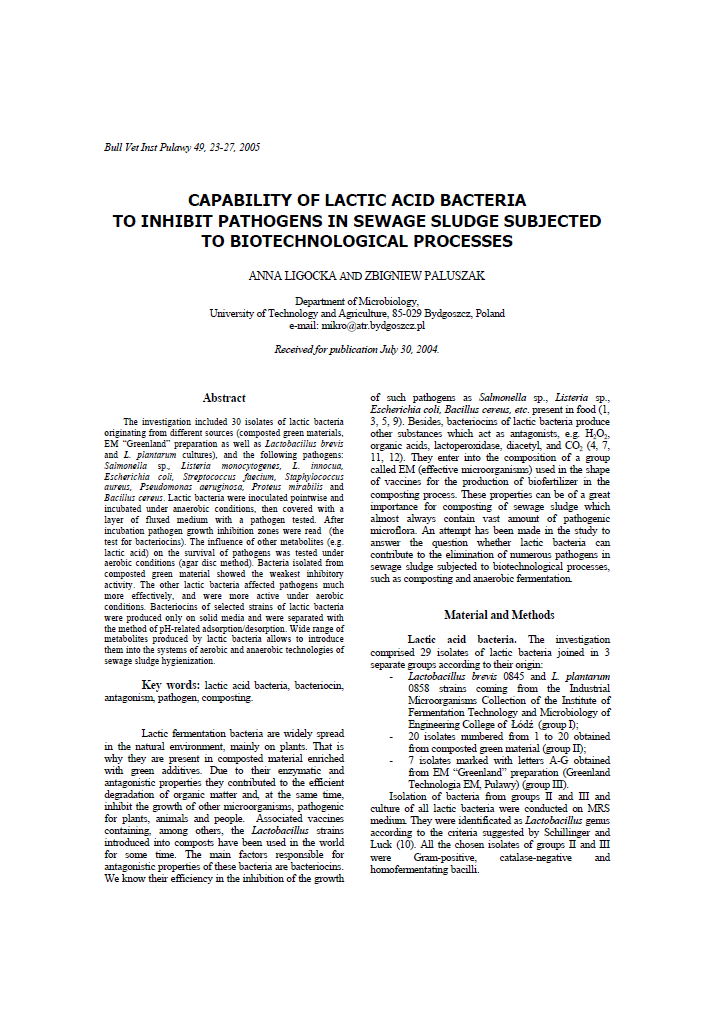 The investigation included 30 isolates of lactic bacteria originating from different sources (composted green materials, EM “Greenland” preparation as well as Lactobacillus brevis and L. plantarum cultures), and the following pathogens: Salmonella sp., Listeria monocytogenes, L. innocua, Escherichia coli, Streptococcus faecium, Staphylococcus aureus, Pseudomonas aeruginosa, Proteus mirabilis and Bacillus cereus. Lactic bacteria were inoculated pointwise and incubated under anaerobic conditions, then covered with a layer […]