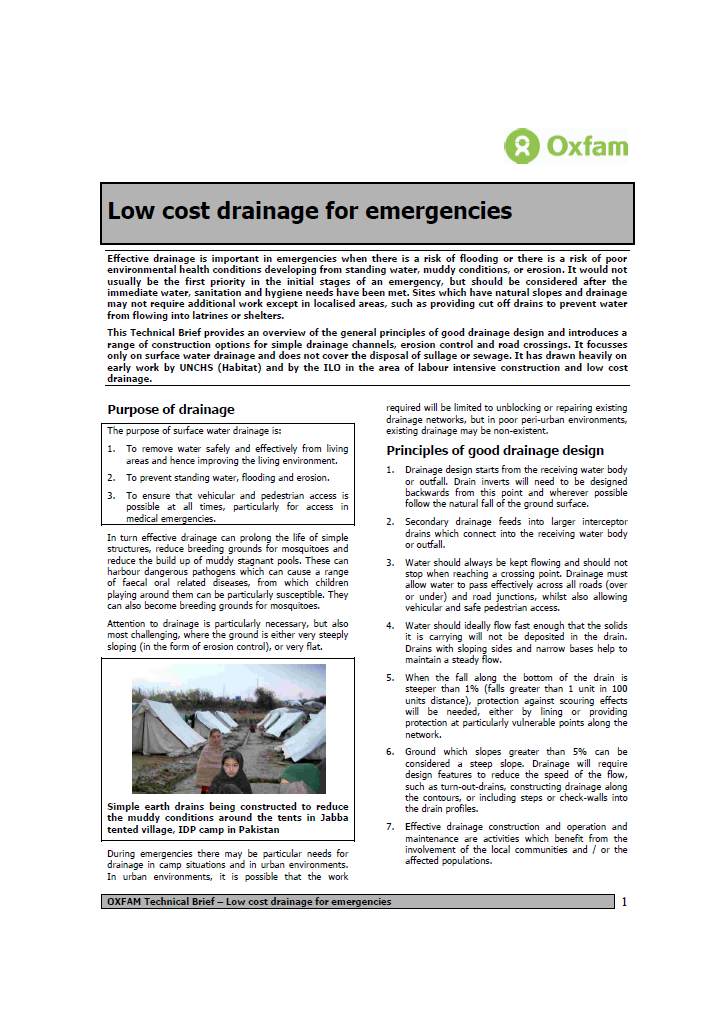 Effective drainage is important in emergencies when there is a risk of flooding or there is a risk of poor environmental health conditions developing from standing water, muddy conditions, or erosion. It would not usually be the first priority in the initial stages of an emergency, but should be considered after the immediate water, sanitation and hygiene needs have been met. Sites which have natural […]