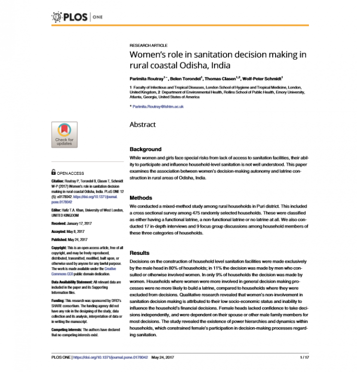 While women and girls face special risks from lack of access to sanitation facilities, their ability to participate and influence household-level sanitation is not well understood. This paper examines the association between women’s decision-making autonomy and latrine construction in rural areas of Odisha, India. A mixed-method study among rural households was conducted in Puri district. This included a cross sectional survey among 475 randomly selected households. […]