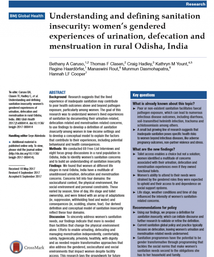 Background Research suggests that the lived experience of inadequate sanitation may contribute to poor health outcomes above and beyond pathogen exposure, particularly among women. The goal of this research was to understand women’s lived experiences of sanitation by documenting their urination-related, defecation-related and menstruation-related concerns, to use findings to develop a definition of sanitation insecurity among women in low-income settings and to develop a conceptual […]