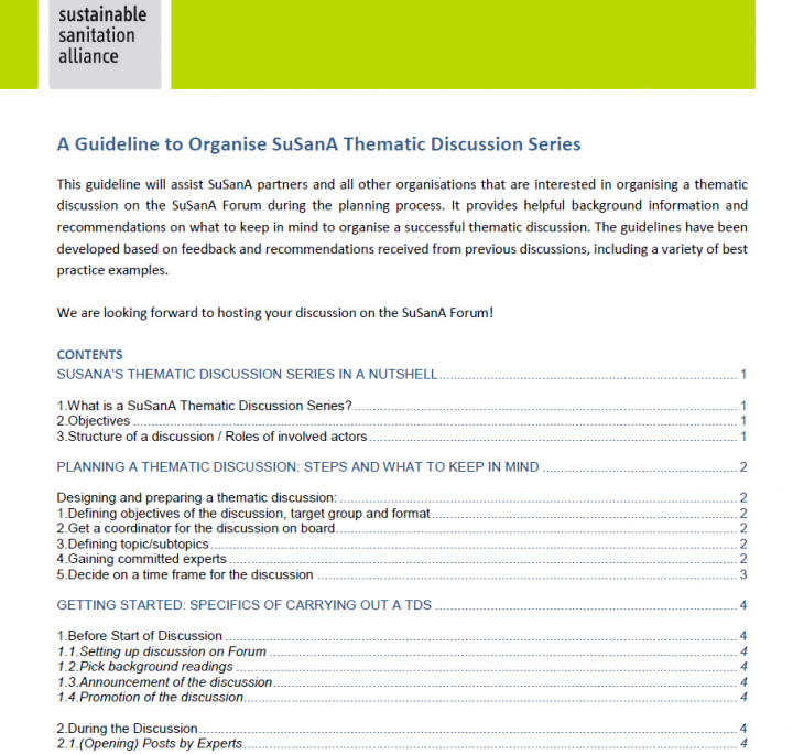 This guideline will assist SuSanA partners and all other organisations that are interested in organising a thematic discussion on the SuSanA Forum during the planning process. It provides helpful background information and recommendations on what to keep in mind to organise a successful thematic discussion. The guidelines have been developed based on feedback and recommendations received from previous discussions, including a variety of best practice […]