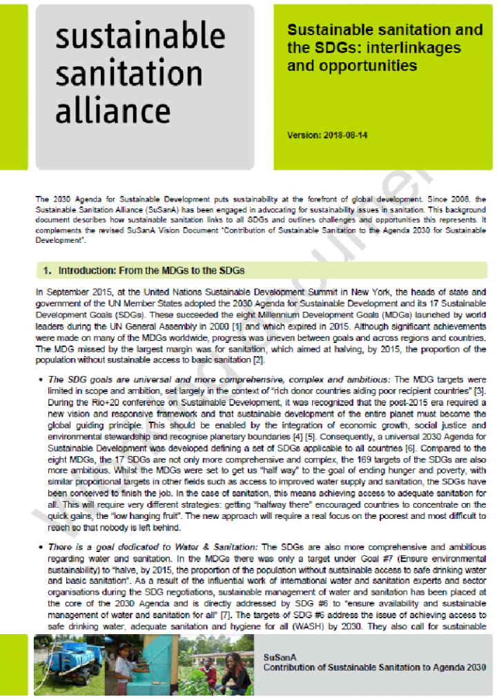 The 2030 Agenda for Sustainable Development puts sustainability at the forefront of global development. Since 2008, the Sustainable Sanitation Alliance (SuSanA) has been engaged in advocating for sustainability issues in sanitation. This background document describes how sustainable sanitation links to all SDGs and outlines challenges and opportunities this represents. It complements the revised SuSanA Vision Document “Contribution of Sustainable Sanitation to the Agenda 2030 for […]