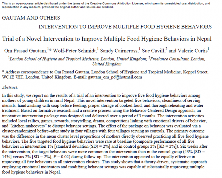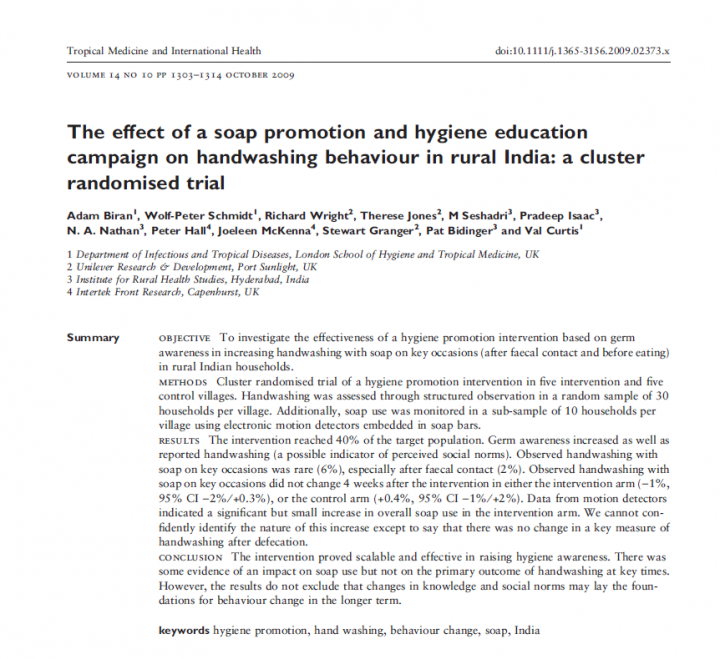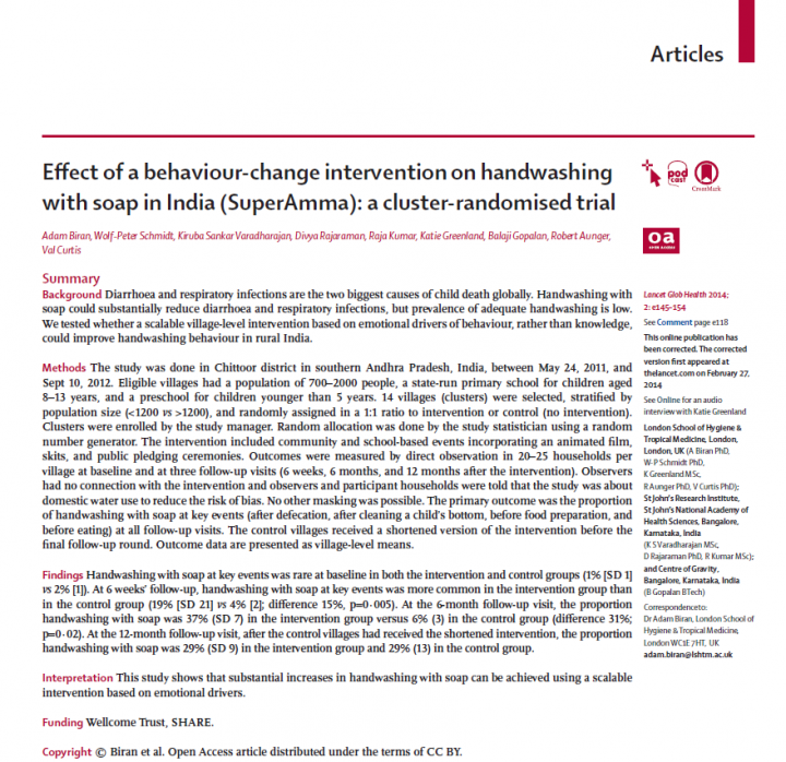Diarrhoea and respiratory infections are the two biggest causes of child death globally. Handwashing with soap could substantially reduce diarrhoea and respiratory infections, but prevalence of adequate handwashing is low. Through this research it was tested whether a scalable village-level intervention based on emotional drivers of behaviour, rather than knowledge, could improve handwashing behaviour in rural India.