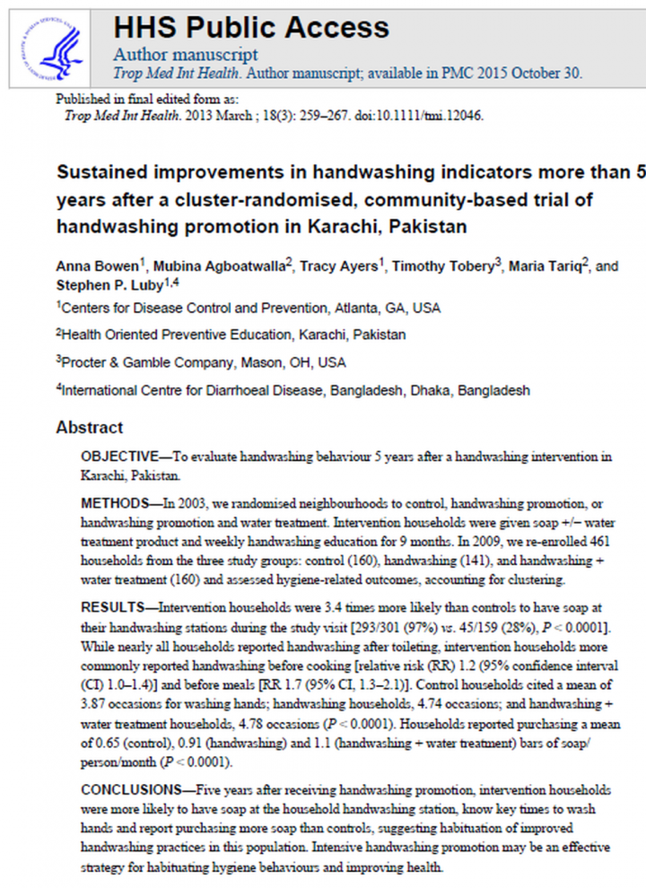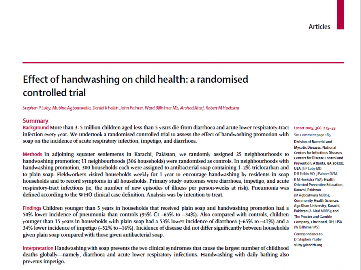 More than 3·5 million children aged less than 5 years die from diarrhoea and acute lower respiratory-tract infection every year. A randomised controlled trial had been undertaken to assess the effect of handwashing promotion with soap on the incidence of acute respiratory infection, impetigo, and diarrhoea.