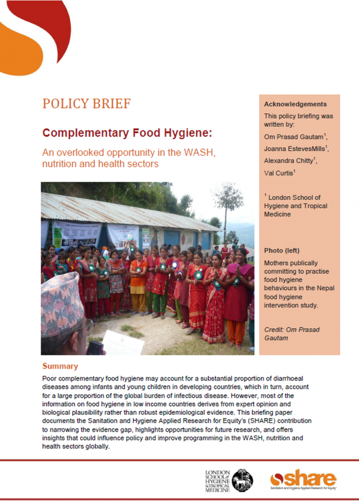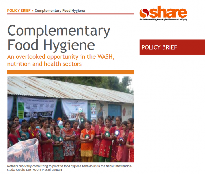 This policy brief highlights the often overlooked opportunity that addressing complementary food hygiene offers the WASH, nutrition and health sectors for improving health outcomes. It outlines SHARE's contribution to narrowing the evidence gap concerning the relationship between food hygiene and child health, indicates opportunities for future research, and offers insights that could influence policy and improve programming in the WASH, nutrition and health sectors globally.