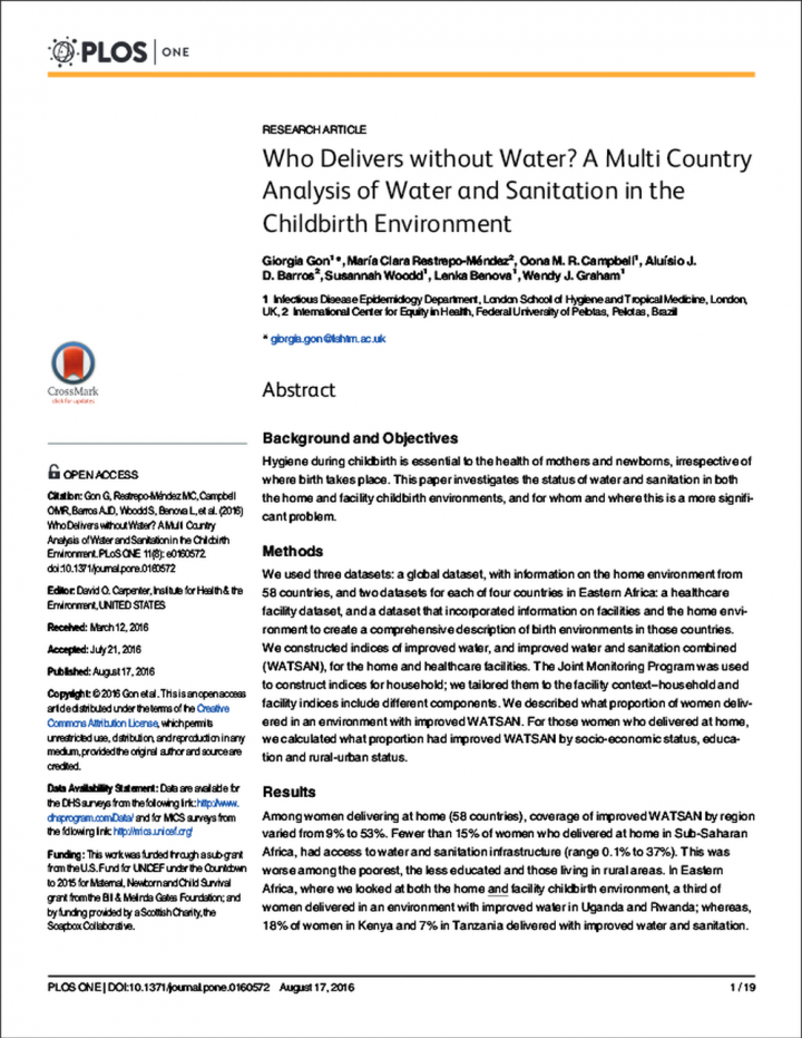 Background and Objectives Hygiene during childbirth is essential to the health of mothers and newborns, irrespective of where birth takes place. This paper investigates the status of water and sanitation in both the home and facility childbirth environments, and for whom and where this is a more significant problem. Methods We used three datasets: a global dataset, with information on the home environment from 58 countries, and two […]