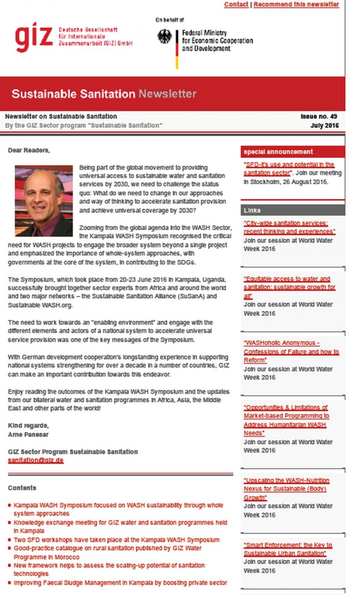 Archived newsletters of the regular electronic news bulletin from the sustainable sanitation projects. These newsletters were sent to subscribed members involved in initiatives and projects in the field of sanitation. Discusses news, publications, books, studies, conferences, online information, and events