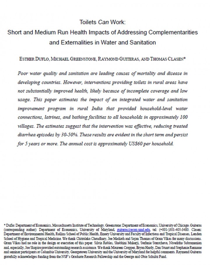 Poor water quality and sanitation are leading causes of mortality and disease in developing countries. However, interventions providing toilets in rural areas have not substantially improved health, likely because of incomplete coverage and low usage. This paper estimates the impact of an integrated water and sanitation improvement program in rural India that provided household - level water connections, latrines, and bathing facilities to all households […]