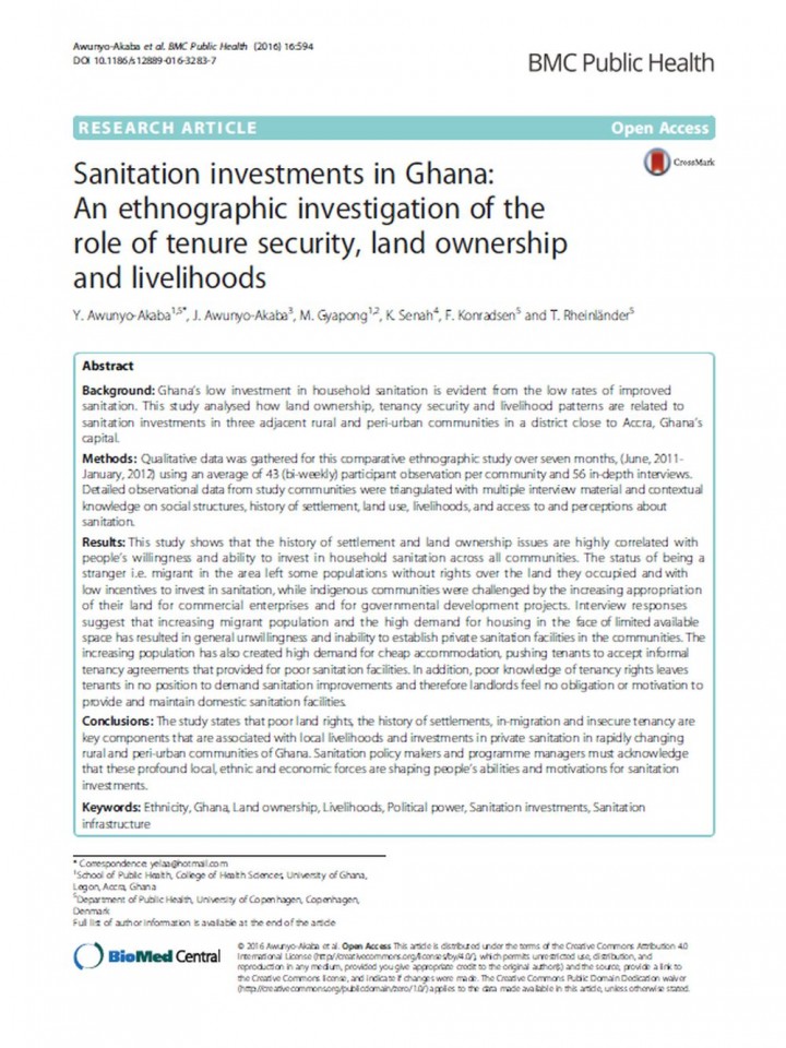 Ghana’s low investment in household sanitation is evident from the low rates of improved sanitation. This study analysed how land ownership, tenancy security and livelihood patterns are related to sanitation investments in three adjacent rural and peri-urban communities in a district close to Accra, Ghana’s capital.