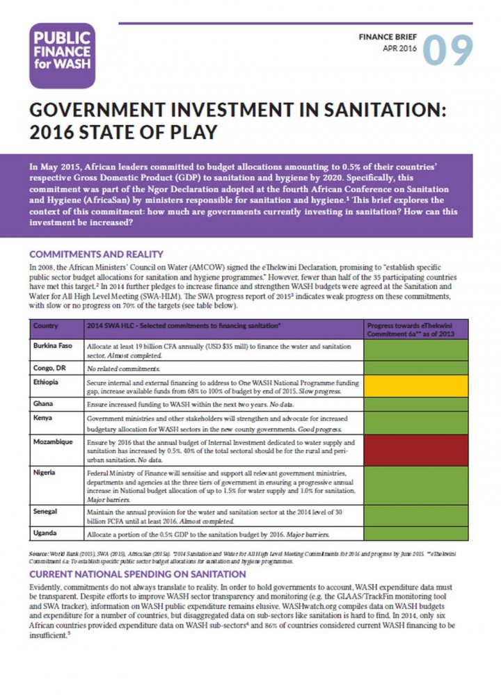 In May 2015, African leaders committed to budget allocations amounting to 0.5% of their countries’ respective Gross Domestic Product (GDP) to sanitation and hygiene by 2020. Specifically, this commitment was part of the Ngor Declaration adopted at the fourth African Conference on Sanitation and Hygiene (AfricaSan) by ministers responsible for sanitation and hygiene.1 This brief explores the context of this commitment: how much are governments […]
