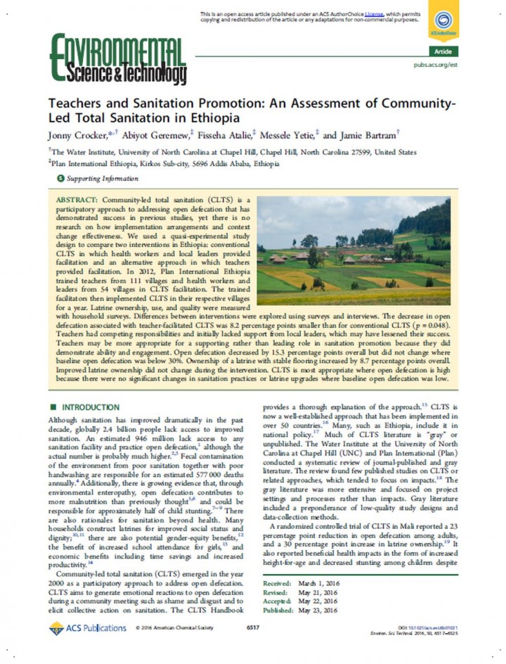 Community-led total sanitation (CLTS) is a participatory approach to addressing open defecation that has demonstrated success in previous studies, yet there is no research on how implementation arrangements and context change effectiveness. We used a quasi-experimental study design to compare two interventions in Ethiopia: conventional CLTS in which health workers and local leaders provided facilitation and an alternative approach in which teachers provided facilitation. In […]