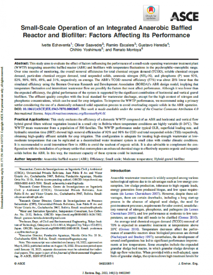 This study aims to evaluate the effect of factors influencing the performance of a small-scale operating wastewater treatment plant (WWTP) integrating anaerobic baffled reactor (ABR) and biofilters with temperature fluctuations in the psychrophilic–mesophilic range. Over nine months of monitoring, the overall removal efficiencies for total chemical oxygen demand (TCOD), soluble chemical oxygen demand, particulate chemical oxygen demand, total suspended solids, ammonia nitrogen (NH3–N), and phosphorus […]