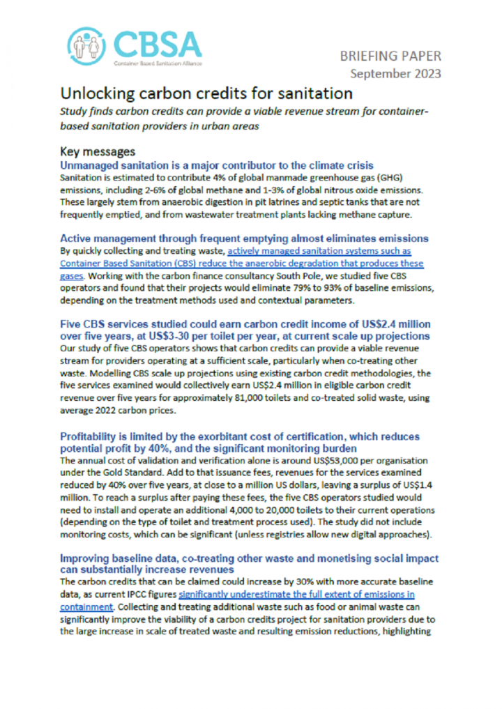 This briefing paper informs about a study carried out by the Container Based Sanitation Alliance (CBSA). Working with the carbon finance consultancy South Pole, five CBS operators were examined. The results show that their projects would eliminate 79% to 93% of baseline emissions, depending on the treatment methods used and contextual parameters. The study of five CBS operators shows that carbon credits can provide a viable […]