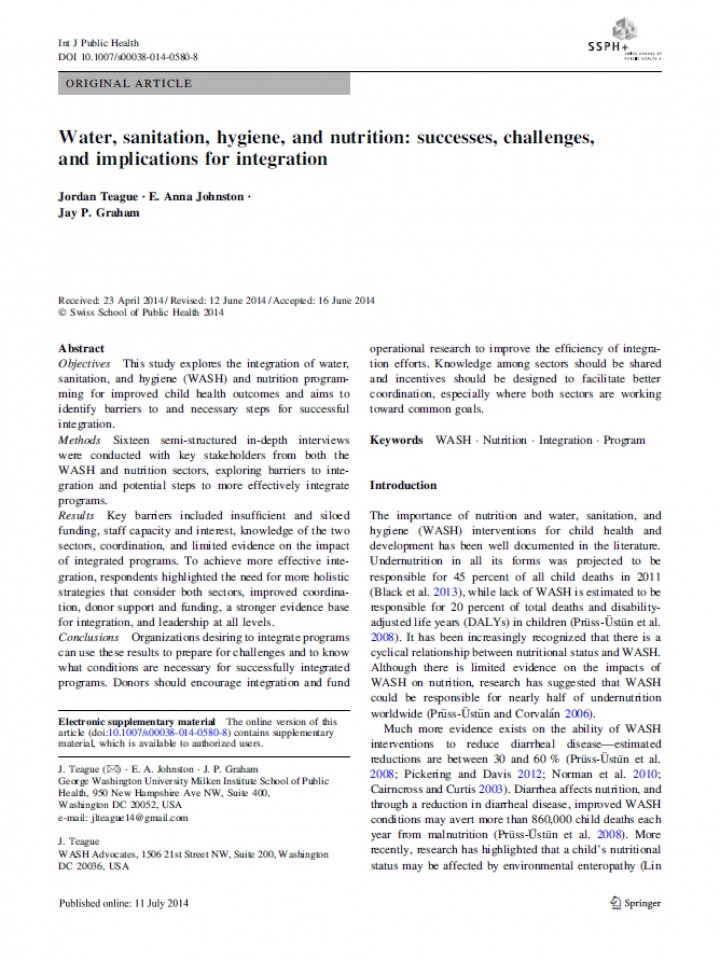 Objectives: This study explores the integration of water, sanitation, and hygiene (WASH) and nutrition programming for improved child health outcomes and aims to identify barriers to and necessary steps for successful integration. Methods: Sixteen semi-structured in-depth interviews were conducted with key stakeholders from both the WASH and nutrition sectors, exploring barriers to integration and potential steps to more effectively integrate programs. Results Key barriers included insufficient and […]