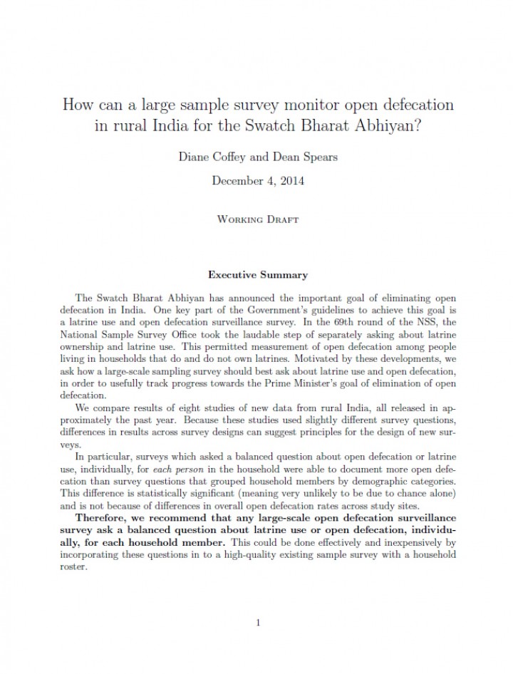 Based on the results, the following recommendations to any organization considering a large-scale, India-wide sample survey to monitor open defecation, latrine use, and progress towards the Swatchh Bharat Mission in rural India are made: 1. Ask about open defecation as part of an existing survey that already includes a household roster. 2. Ask about open defecation and latrine use separately for each household member, in the order […]