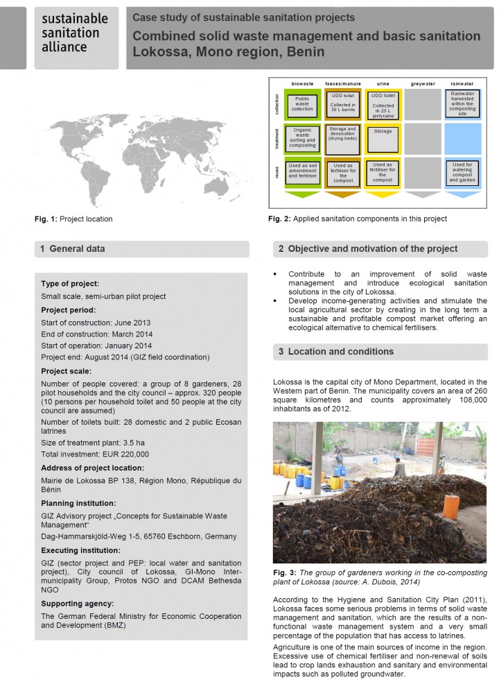 This case study describes a combined waste management and sustainable sanitation project conducted by GIZ in Lokossa, Mono region, Benin. The project has been developed by the GIZ advisory project “Concepts for Sustainable Waste Management” in cooperation with the GIZ Water and Sanitation Programme (PEP) of Benin. Local partners include the municipality of Lokossa, the NGOs Protos, DCAM Bethesda and the municipal association GI-Mono.