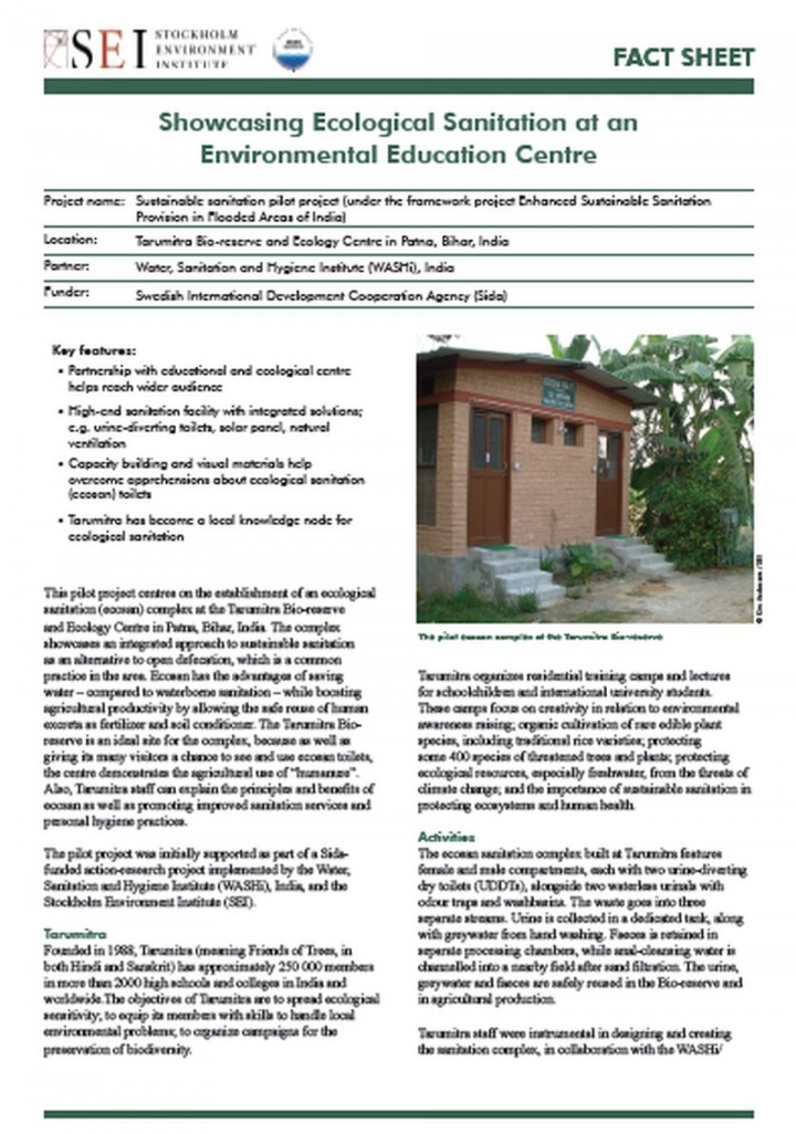 This fact sheet describes how the Tarumitra Bio-reserve and Ecology Centre in Patna, northern India, is supporting a sustainable sanitation project through demonstration and education.