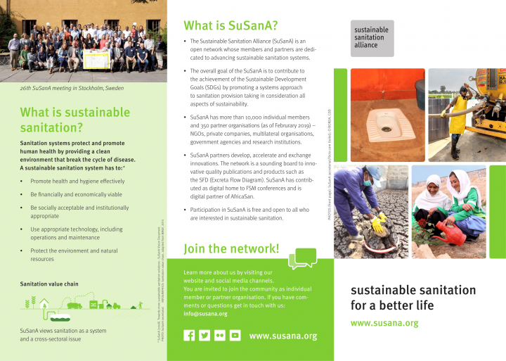 This flyer gives a general overview of SuSanA, its objectives, working group topics, roles, discussion forum and funding. It needs to be printed on paper that is slightly larger than A4 so that it can be a folder in the "altar fold". There is a 2019 version of the flyer available in English and French, and a version from 2018 in Arabic and Spanish.