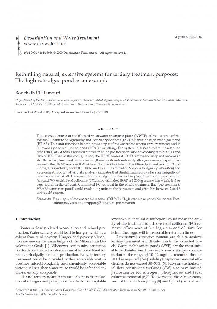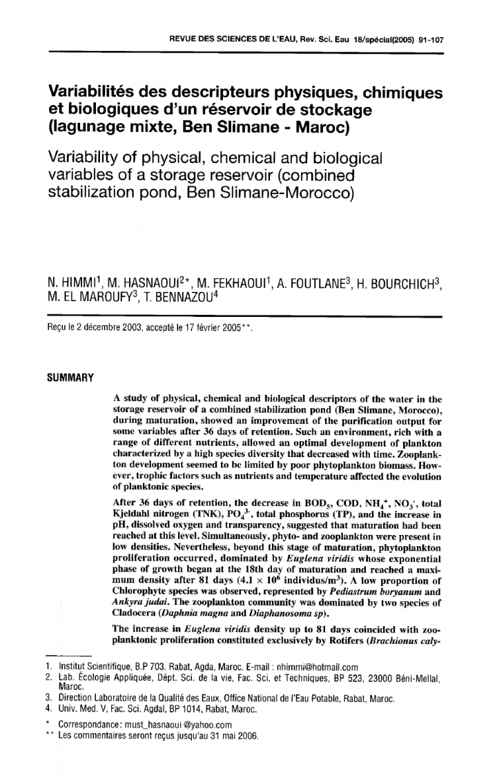 A study of physical, chemical and biological descriptors of the water in the storage réservoir of a combined stabilization pond (Ben Slimane, Morocco), during maturation, showed an improvement of the purification output for some variables after 36 days of rétention. Such an environment, rich with a range of différent nutrients, allowed an optimal development of plankton characterized by a high species diversity that decreased with […]