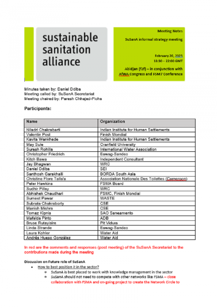 Please find below the meeting notes of the SuSanA informal strategy meeting in Abidjan – in conjunction with AfWA Congress and FSM7 Conference.
